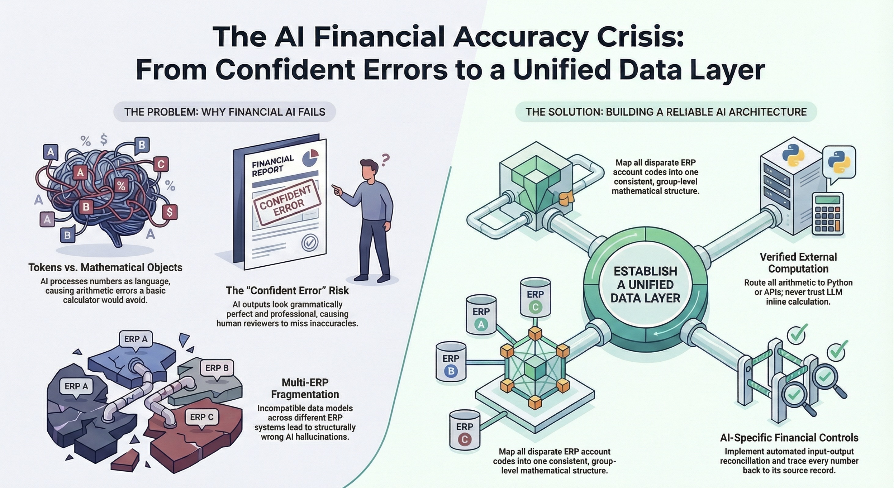 AI models process financial data as language tokens, not mathematical objects, leading to confident errors that bypass traditional finance controls. Finance leaders must solve the data normalization problem, mapping disparate ERP text strings into a single data layer, before deploying AI for financial analysis.